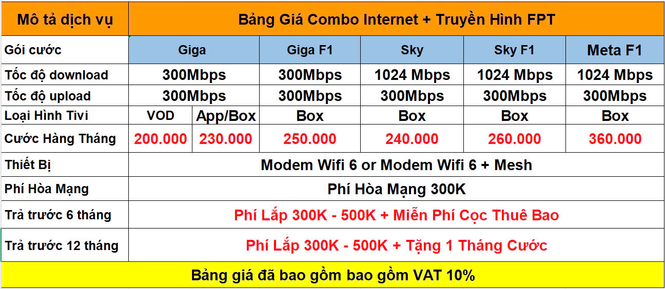Bảng giá gói Combo WiFi + Truyền hình (gói cơ bản)